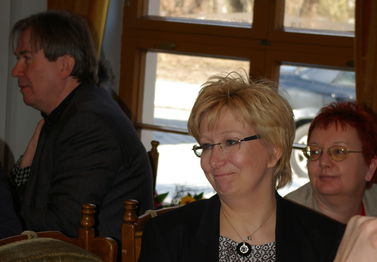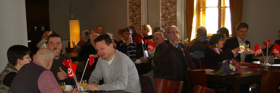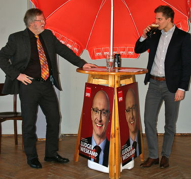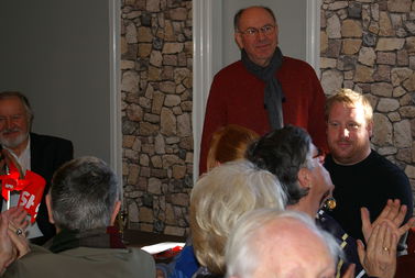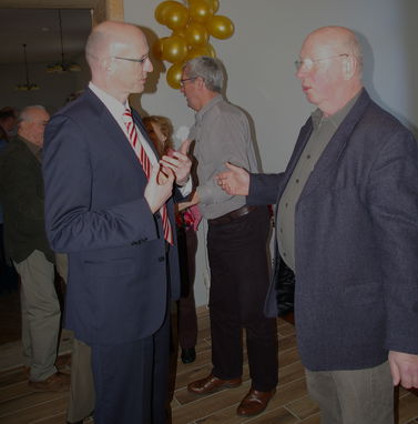 Traditionell zum Abschluss des offiziellen Teils politisierten „Junior und Senior“ Grimm am Stehstammtisch über die politische Konkurrenz und erheiterten die Anwesenden u. a. mit Ausführungen und Mutmaßungen über die Kompetenzen der Mitbewerber bei der Landratswahl. - Anschließend eröffnete Peter Witte für die 60 Anwesenden das Buffet, und im Saal verbreitete sich unter den Keyboard-Klängen von Jeffrey Lee Mills für zwei Stunden eine Atmosphäre entspannter Gespräche oder einfach des Kennenlernens von neuen Gesichtern.
