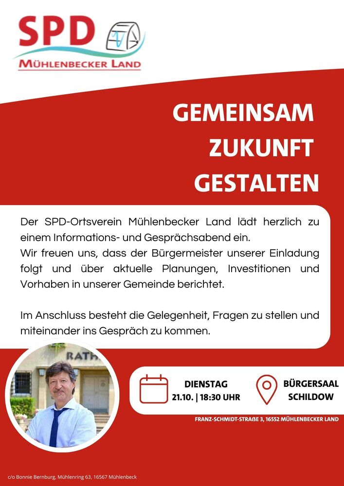 Am Dienstag schon was vor? - Komm doch zu unserem Gesprächsabend in den Bürgersaal Schildow. Wir freuen uns, dass der Bürgermeister unserer Einladung folgt und mit uns und interessierten Bürgerinnen und Bürgern über die Zukunft des Mühlenbecker Landes sprechen wird.