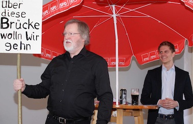 Nachdem Witte konkrete politische Themen angesprochen hatte, u. a. die Wiedererrichtung der Brücke für den Zehnruthenweg über die Autobahn nach dem Ausbau der A 10 und den geplanten Bau einer geronto-psychiatrischen Fachklinik am Summter See, ging Smaldino-Stattaus auf Mühen und Erfolge von politischer Führung und Verwaltungsarbeit ein. - Musikalisch dezent, aber prägnant unterstützt von Jeffrey Lee Mills am Piano erheiterten "Junior und Senior" (Benjamin und Harald Grimm) die Anwesenden mit teils selbstironischen, teils kabarettistischen Darstellungen zur Kommunalpolitik. Inspiriert von einem Plakat der BI A 10 stimmten sie mit allen Anwesenden auf den bekannten KARAT-Ohrwurm die Brücken-Hymne an: