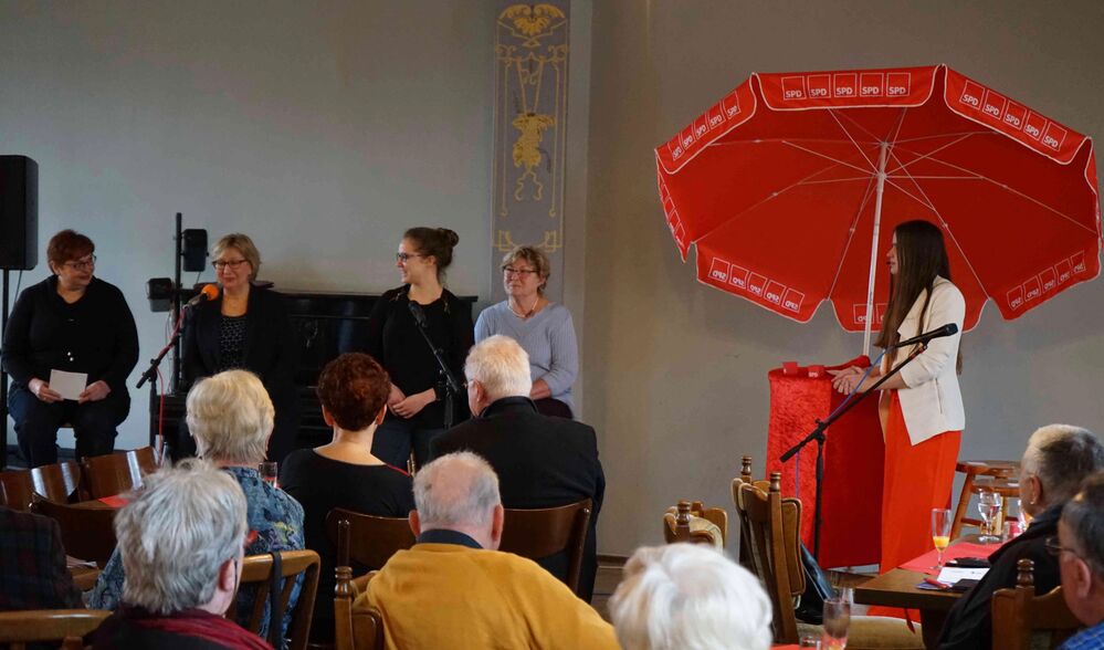 An der lebhaften Diskussion beteiligten sich mehrere Frauen aus dem Saal, indem sie sich auf den für sie freigehaltenen Hocker neben der Moderatorin setzten, stellten Fragen, berichteten von eigenen Erlebnissen und formulierten Erwartungen an die Zukunft. „So eine Parteiveranstaltung habe ich hier noch nie erlebt“, zeigte sich die Vorsitzende des Bürgervereins Bieselheide beeindruckt: „Das ist eine ganz andere Atmosphäre, wenn vorne nur Frauen sitzen, untereinander und mit den Gästen im Saal diskutieren.“ Ihr Dank an die Runde wurde mit großem Beifall bedacht.