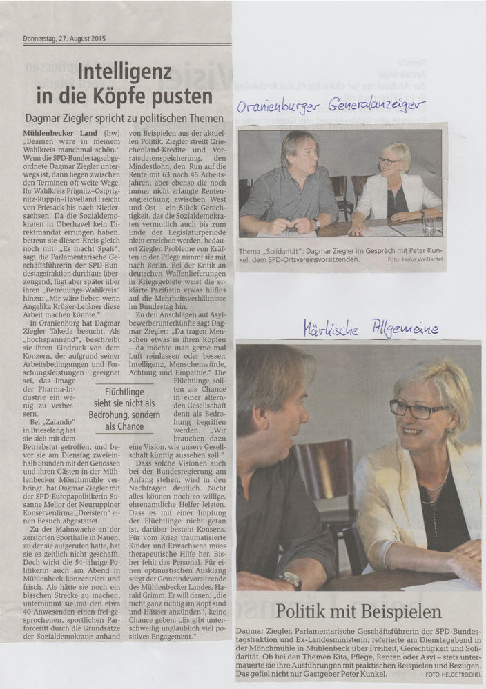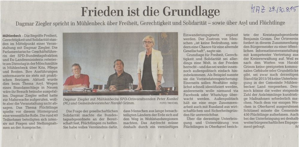 Freiheit, Gerechtigkeit und Solidarität werden von Sozialdemokraten immer sozial verstanden. Das machte Dagmar Ziegler in ihrer einleitenden Ansprache deutlich, die beinahe den Folgen des Brandanschlags auf eine Flüchtlingsunterkunft zum Opfer gefallen wäre: Die Parlamentarische Geschäftsführerin der Bundestagsfraktion hatte selbst zu einer Mahnwache in Nauen aufgerufen, wollte aber die lange angekündigte öffentliche Veranstaltung in der Mönchmühle nicht absagen. Erwartungsgemäß spielte das Thema Flüchtlinge auch hier eine wesentliche Rolle.